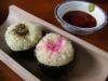 紅花おむすび(酢飯)はわさび醤油につけていただきます。ごはんがホカホカです。
